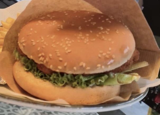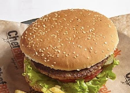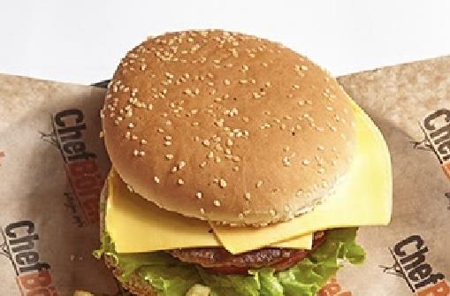 Dana eti, yeşillik, domates, salatalık turşu, Cheddar peyniri, mayonez ve ketçap